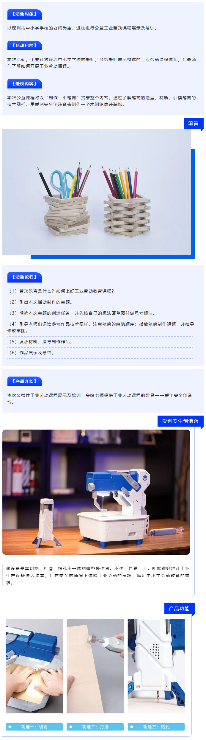 因此愛創科技教育麵向深圳市中小學,開展公益性工業勞動課程展示及培訓活動。報名成功的學校我們進一步確定時間前往學校內開展活動。