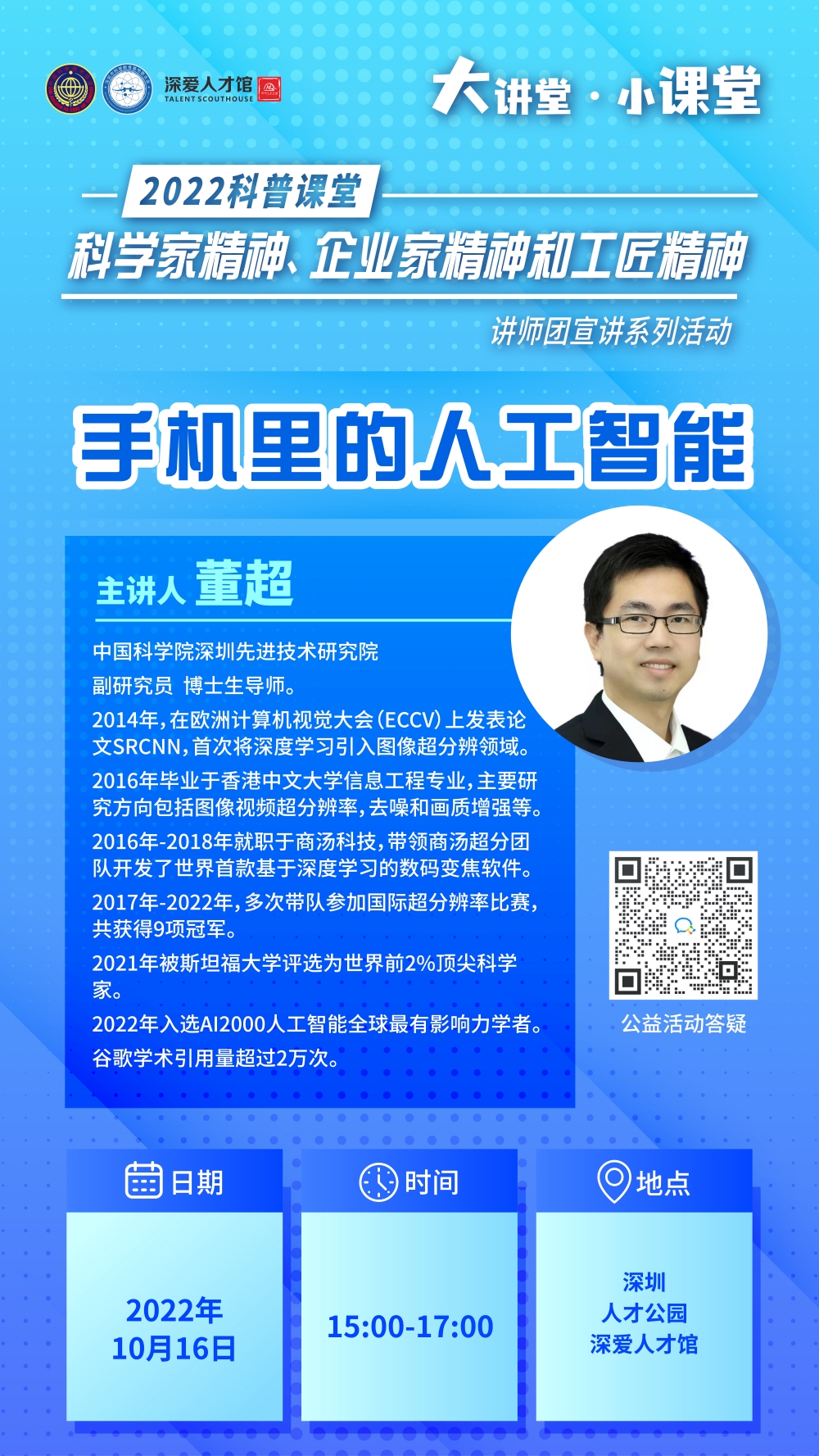 為(wei) 進一步普及人工智能科技星空体育官网入口网站,2022年10月16日下午15點至17點,深圳市科學技術協會(hui) 邀請中國科學院深圳先進技術研究院副研究員博士生導師董超老師到深圳人才公園深愛人才館開展人工智能科普講座。