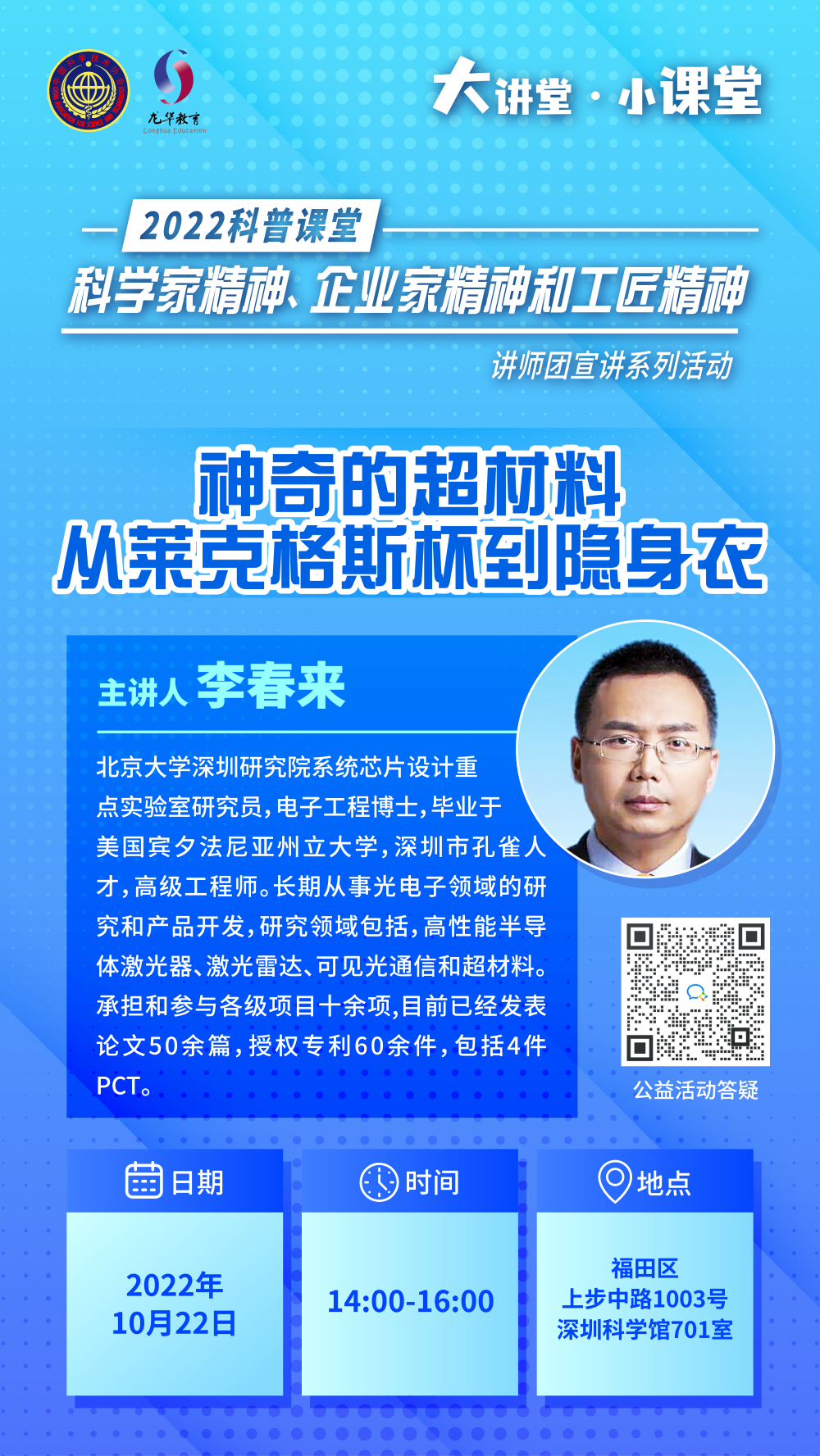 深圳市科協打造“科普課堂”——科學家精神、企業(ye) 家精神和工匠精神講師團基層宣講活動旨在貫徹落實《全民科學素質行動規劃綱要(2021—2035年)》,充分利用科普資源助推“雙減”工作,以“送科普上門”服務提高公眾(zhong) 終身學習(xi) 能力,通過榜樣力量加強未成年人思想道德建設。